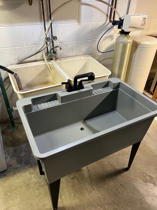 Completed installation of customer-supplied laundry sink and faucet in utility area of property. Properly connected plumbing to existing water supply and drain lines, positioning new gray plastic utility sink adjacent to older existing double-basin unit. All connections were tested for proper function and leaks with no issues observed.