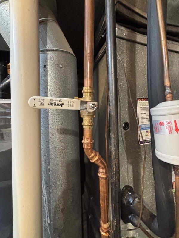 Installed a new Conbraco valve for exterior faucet system that was previously removed during June water heater installation and humidifier removal. Cut into existing copper supply line and properly installed valve to restore functionality to homeowner's outdoor hose bibs before winter.