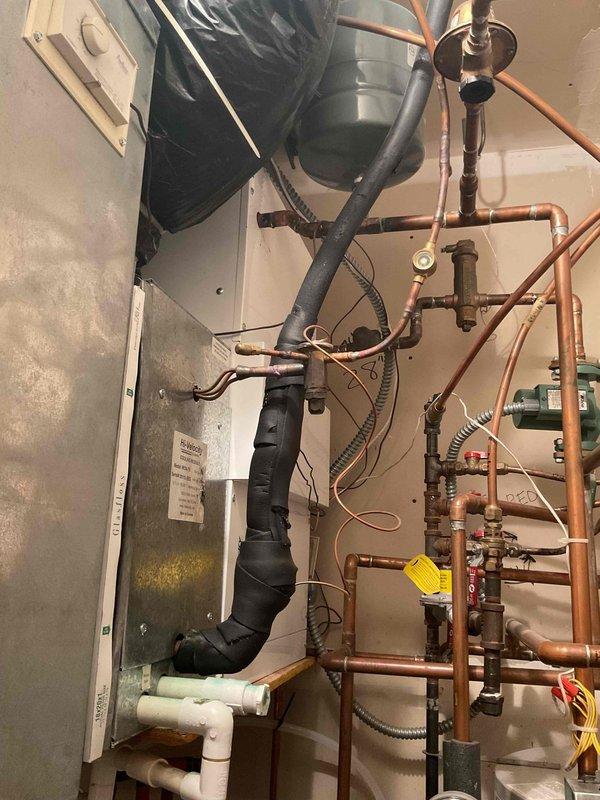 Diagnosed and repaired no heat condition on aging air handler unit connected to water heater. Inspection identified a failed zone head as the root cause. Successfully restored heat function by replacing the defective zone head on the hydronic heating system.