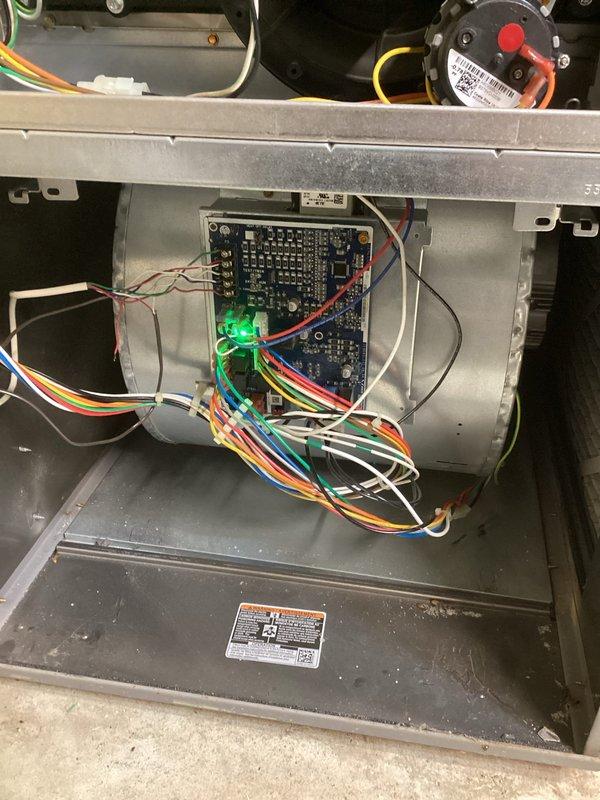 Replaced malfunctioning ECM blower motor module and reconnected system in furnace. Performed operational verification through system cycling to confirm proper function. Equipment is now working correctly with new Auer Steel Plymouth WC variable speed ECM motor module installed and configured.
